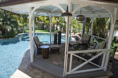 Our custom 14 foot gazebo, situated between the swimming pool and spa, seats five people comfortably. A rinse off shower is adjacent to the gazebo for use before and after pool time (or any time). The gazebo, a wonderful place to sit or receive a massage, has two waterfalls that spill off the roof into the pool for added visual and acoustic ambiance.